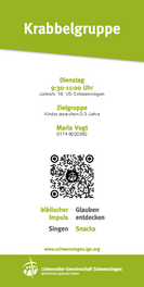"Mein Gott ist so groß, so stark und so mächtig..." Mit fröhlichen Liedern beginnt jede Krabbelgruppe für die 0-3 Jährigen und ihre Mamas und wird durch die Handpuppe "Kiki", eine kurze biblische Geschichte, einen gemeinsamen Snack, Basteleien und eine ausgiebige Spielzeit zu einer bunten Zeit!
